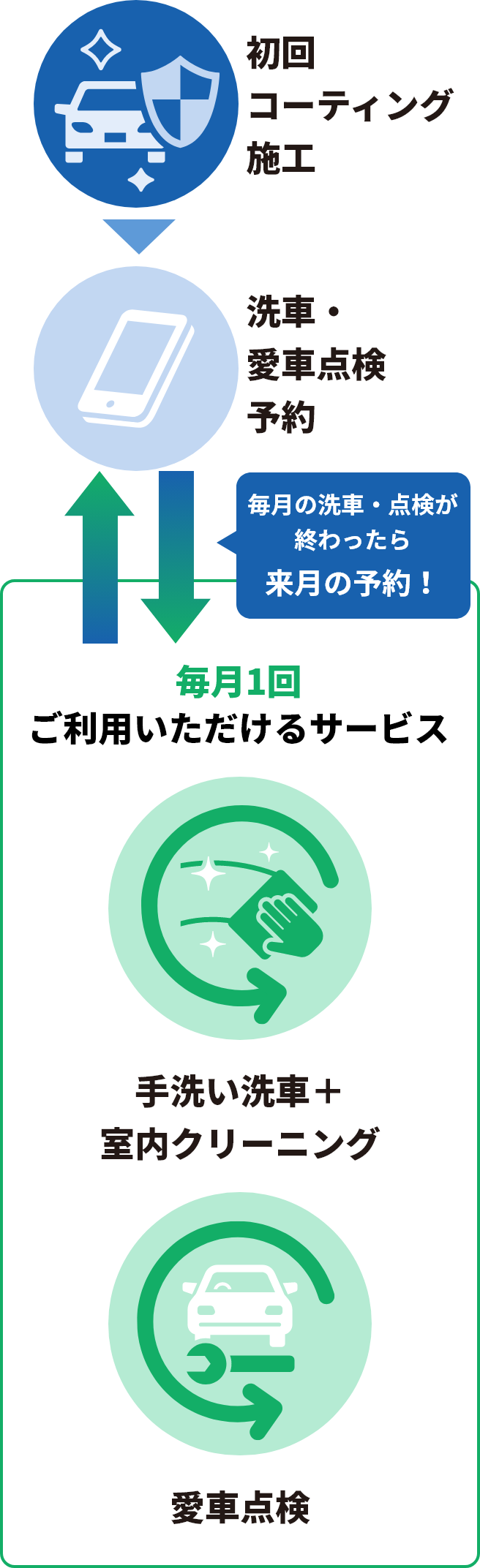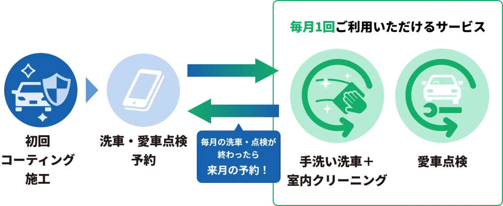 初回コーティング施工後、毎月「手洗い洗車+室内クリーニング」と「愛車点検」の